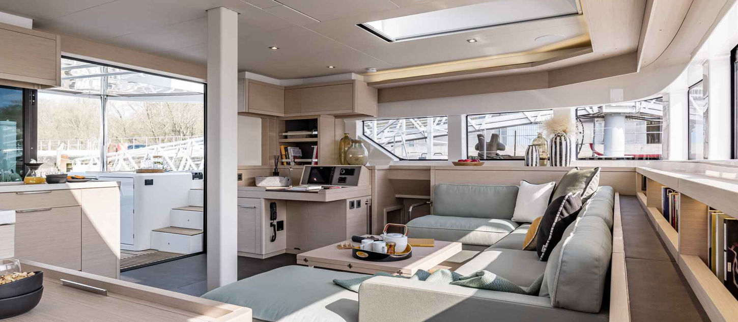 Ses grandes fenêtres et son aménagement ouvert assurent une luminosité naturelle et une excellente ventilation dans tout le bateau, renforçant cette sensation d’espace et de liberté en mer.